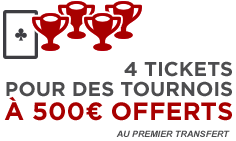 Effectuez votre 1er transfert en argent réel vers le logiciel poker, nous vous créditons 4 tickets pour les tournois de bienvenue à 500 € !
