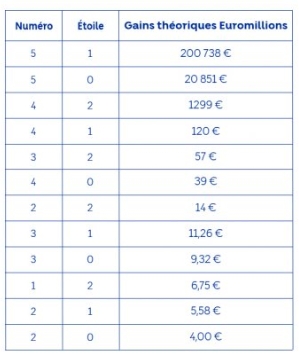 NB : Certains rangs de gains sont exclusifs au jeu EuroMillions – My Million. Exemple : si vous avez 2 bons numéros et 0 bonne étoile, vous gagnez 4 €.