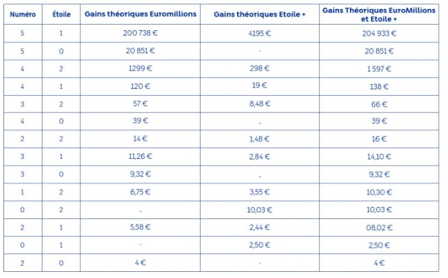 Si vous jouez à EuroMillions – My Million et que vous cochez l’option de jeu Etoile +, voici les gains théoriques que vous pouvez gagner grâce à l’option Etoile +(2e) :