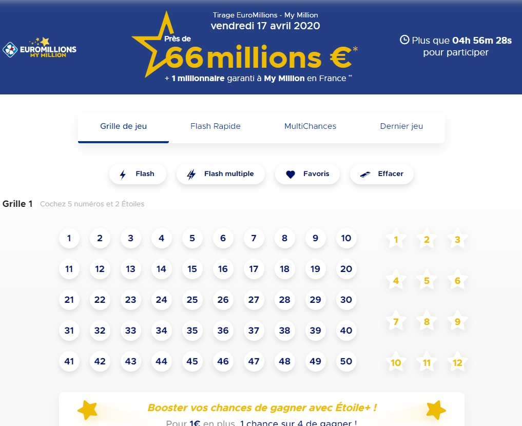 Une grille EuroMillions – My Million se compose de 50 numéros (de 1 à 50) et 12 étoiles (de 1 à 12).