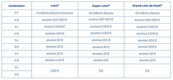 Si vous jouez à LOTO, Super LOTO ou à Grand LOTO de Noel, sans cocher l’option de jeu 2nd Tirage, voici les gains théoriques que vous pouvez gagner :