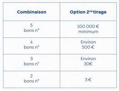 Vous avez la possibilité de cocher l’option de jeu “2nd tirage”, en rejouant vos 5 numéros et augmenter vos chances de gain à près d’une sur 4 pour un Jackpot de 100 000€ minimum à partager.