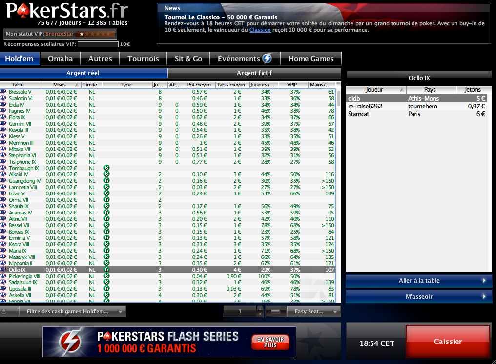 Pour essayer nos jeux gratuits, ouvrez le logiciel PokerStars, rendez-vous dans le lobby principal et cliquez sur le bouton « Argent fictif ». Puis choisissez simplement le jeu auquel vous voulez jouer. Si vous épuisez tous vos jetons en argent fictif, prenez un siège à une table de ring game et vous recevrez une recharge gratuite.